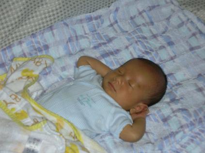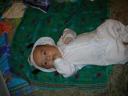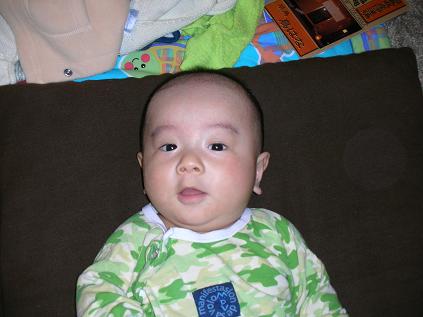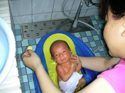 0ヶ月。入浴中。 この頃は『こんなに細くて大丈夫!?』なんて心配したな~。無用でした…。 1ヶ月。おっさんか!(笑) 実家から戻りたての頃。早くも大物振りを発揮!(早すぎ)