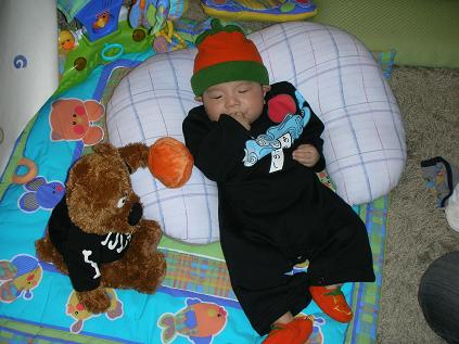 3ヶ月。ハロウィン。 帽子がきつくて可哀想なことをした。 でも来年は被れないからと無理矢理…(爆)