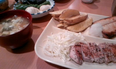 キッチンに一応ついてるベビーゲートが馬鹿になっちゃって あっさり坊主に突破されキッチンに侵入されまくりのいたずらされまくりなので いつも夕飯の支度に1時間もかけません。 まあただのめんどくさがりで手際がいいわけでもありません(爆) でも高校の時ラーメン屋でバイトしてたので 生ラーメン作る時だけは手際いいかしらん?(笑) 取り敢えず本日のメニュー ●豚肉スパイシー焼き千切りキャベツ添え ●サバ塩焼き大根おろし添え ●皮つきフライドポテト ●ワカメと豆腐とネギの味噌汁 ●きゅうりとカブとナスの糠どこ(例によって義母の…) 石焼き風フライパンで焼いているので油は使わずに豚肉の脂だけで焼けます♪ でも芋は油で揚げてるしな…(爆)